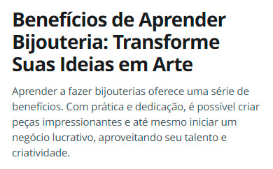 Eleve suas Habilidades a Novos Níveis de Excelência. Com o Curso de Bijouteria, Aprimore suas Competências e Amplie Seu Conhecimento com Técnicas Avançadas e Profundas Reflexões. É a Oportunidade de Refinar seu Talento e Sobressair com Expertise no Fascinante Universo da Bijouteria.