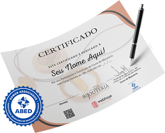 Nossa parceria com a ABED garante a qualidade e a seriedade do seu desenvolvimento profissional. Ao receber um certificado que não apenas traz seu nome, mas também o respaldo de uma instituição renomada, seu mérito é reconhecido com autoridade e prestígio dentro do setor de Bijouteria.