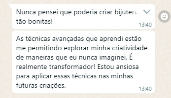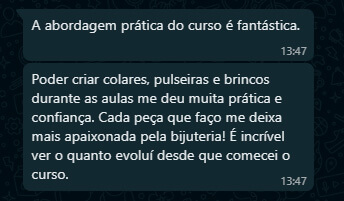 Transforme sua paixão em expertise: nossos alunos não apenas aprendem, eles dominam as técnicas de criação de bijouterias. Com uma compreensão aprofundada e aplicação prática, preparamos você não apenas para ser uma entusiasta, mas líder no mundo da Bijouteria.