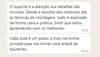 Não se trata apenas de adquirir conhecimento, mas de embarcar em uma jornada pela arte da Bijouteria com total suporte. Nossa equipe estará sempre ao seu lado, assegurando que cada passo seja seguro e que todas as suas dúvidas sejam prontamente esclarecidas. Inicie sua jornada rumo à especialização em Bijouteria – a arte da criação de bijouterias está ao seu alcance!